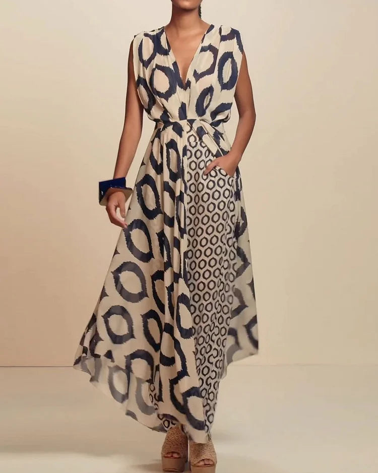 Completo Due Pezzi Casual Senza Maniche a Fantasia con Vita Sottolineata